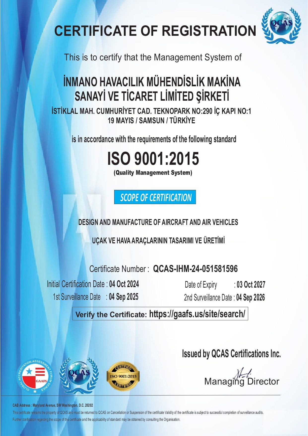 INMANO is proud to have international certificates by adopting the highest quality standards in the sector in the field of unmanned aerial vehicles (UAV) and general aviation aircraft production. The certificates we have obtained are an indicator of the excellence and safety in our production processes.